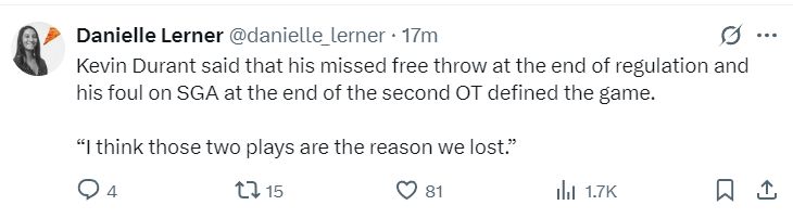 不过赛后杜兰特还是对球队输球揽责了,他表示:我常规时间丢了最关键的罚球,第二个加时赛又犯规让对手领先1分,我认为这两个回合就是我们输球的原因。