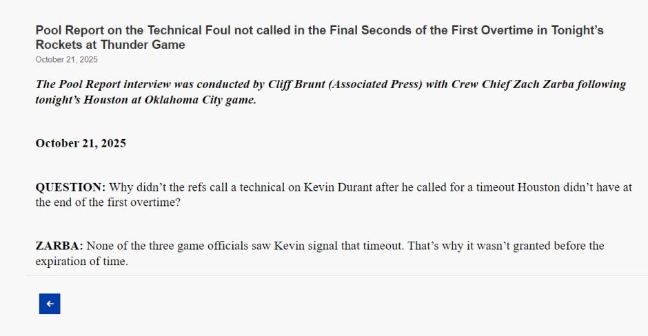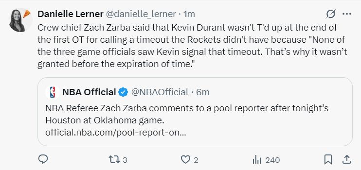本场比赛的主裁判扎克·扎巴也在赛后解释:在第一个加时赛结束时,杜兰特并未因呼出暂停而被吹技术犯规,因为我们三位裁判都没有看到杜兰特有暂停的动作,这就是为什么没有给杜兰特技术犯规的理由。