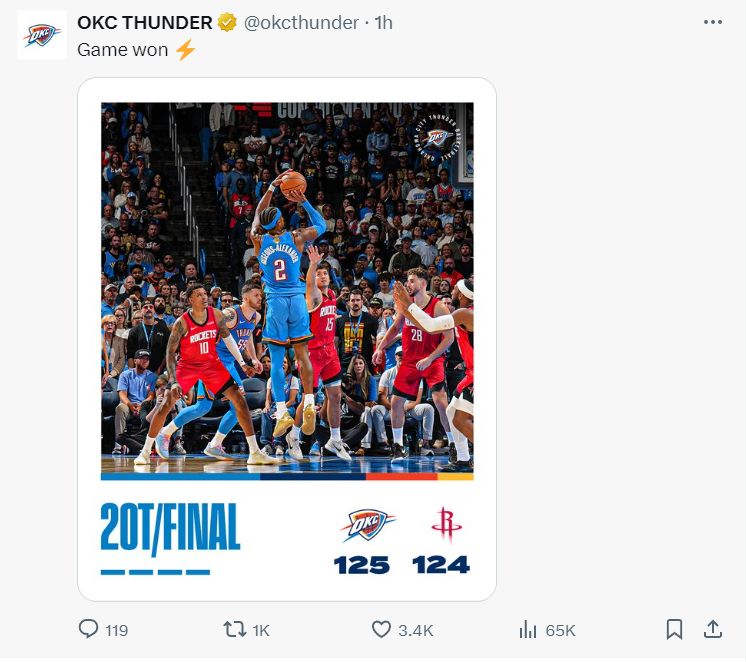 火箭124-125惜败雷霆,NBA揭幕战就双加时,这两支球队的硬实力都非常强劲,最终SGA制造杜兰特第六次犯规,用罚球准绝杀了火箭队,SGA与申京两位超巨都拿到35+的数据。