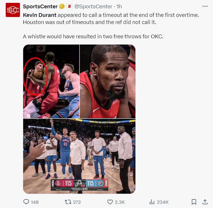 美媒SC都写道,第一个加时赛结束后杜兰特疑似比了一个暂停的手势,火箭没暂停了,他本来应该得到一个技术犯规,那样雷霆就可以提前罚球绝杀比赛了。