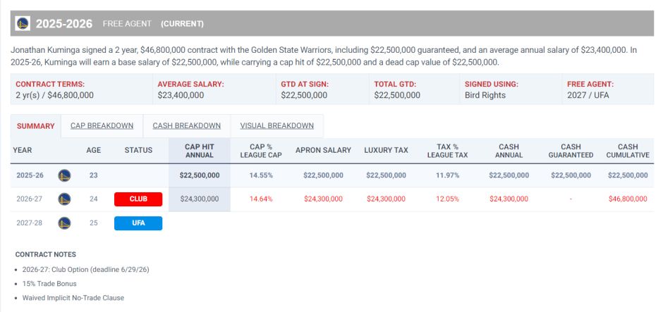 库明加今夏与勇士达成一份两年4680万的续约合同,25-26赛季年薪为2250万,如果勇士交易他才触发15%的交易保证金,这样才能达到两年4850万。如今还有人觉得库明加这个合同贵吗?