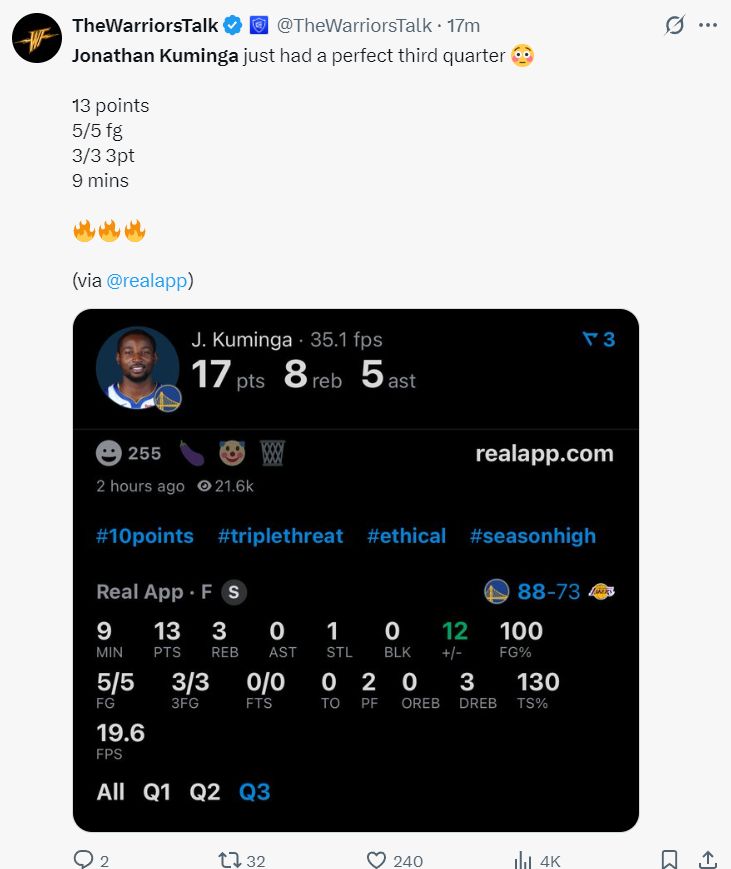 这场比赛的第三节是乔纳森-库明加时间,他单节9分钟里,5中5+三分3中3,拿到13分3篮板1抢断,命中率100%,三分命中率100%,他帮助勇士一举拉开分差。