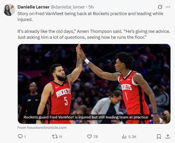 根据火箭队记Danielle Lerner的说法,范弗利特已经成为火箭队的队长,他在训练中会给到年轻球员们一些建议,尤其是出任火箭队先发一号位的阿门-汤普森,他希望帮助阿门成为一名真正的一号位。
