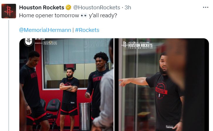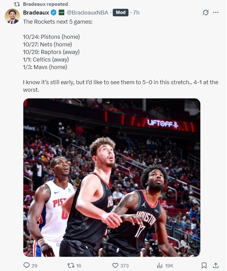 火箭队未来的五场比赛有3场是主场,10月25日会在主场对阵底特律活塞队,两支球队揭幕战都吞下失利,下一场对于两队来说都非常重要,范弗利特届时应该也会在场边观战。