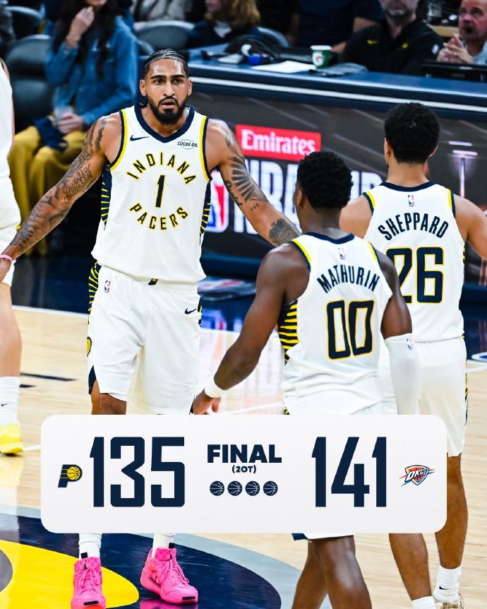 上赛季的总决赛,雷霆通过抢七战胜步行者夺冠。如今新赛季第二场比赛,面对缺少哈利伯顿,特纳已经离队,且内姆哈德只打两节就伤退的步行者,雷霆再度陷入苦战,也是连续第二场比赛鏖战双加时,雷霆成为历史首支开季两场均是双加时球队。