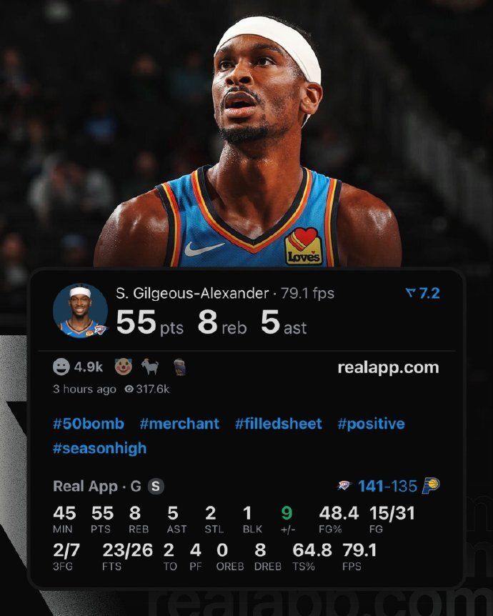 亚历山大再度交出封神的表现,他全场31中15接近5成投篮命中率,其中三分7中2,外加罚球26中23。虽然亚历山大常规时间错失三分绝杀,首个加时赛再度错失绝杀,但第二个加时赛连续得分制胜。