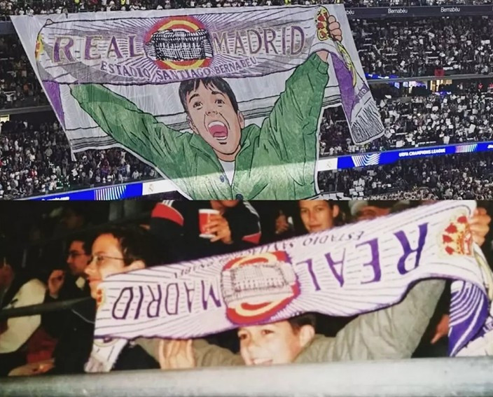 皇马主场迎战尤文图斯时看台展示的致敬TIFO,灵感源自他幼时在伯纳乌的留影。巴斯克斯非常欣慰说道:"这张照片是我在伯纳乌首次观看皇马的比赛,它记录了那一刻,我至今都记忆犹新。当我昨夜在欧冠赛场见证这幅TIFO,我非常震撼也有很多话说不上来。"