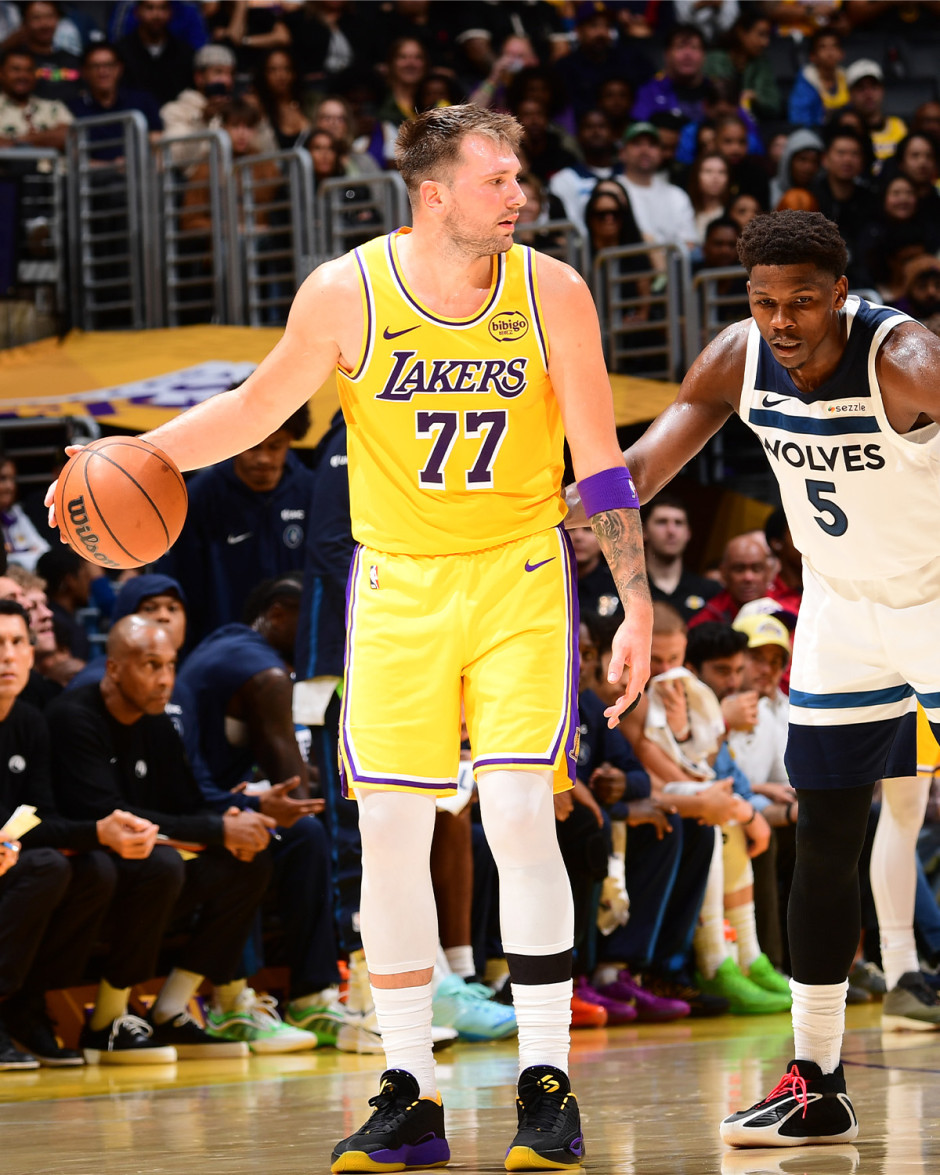 比赛开场,森林狼反客为主打出6-0的攻势,随后更一度将领先优势扩大到两位数。就在球队即将被拉开分差之际,东契奇用单节12投8中独得23分的表现稳住了局面,追平了湖人队史首节得分纪录。全场23次出手命中14球,罚球19中16,最终数据定格在49分11个篮板8次助攻。在湖人生涯的得分新高,成为NBA历史上首位在赛季开局连续两场打出至少40分10个篮板5次助攻的球员。当詹姆斯因伤缺阵,东契奇用行动证明了自己为何是湖人未来的基石。