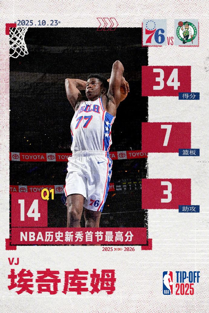 76人探花秀埃奇库姆领跑新秀得分榜,他目前只打了一场比赛,在揭幕战1分险胜凯尔特人的比赛,恩比德9中1梦游,但埃奇库姆站出来与马克西组成双枪闪耀。在马克西狂轰40分之外,埃奇库姆狂轰5记三分,贡献34分7篮板3助攻1抢断表现惊艳。