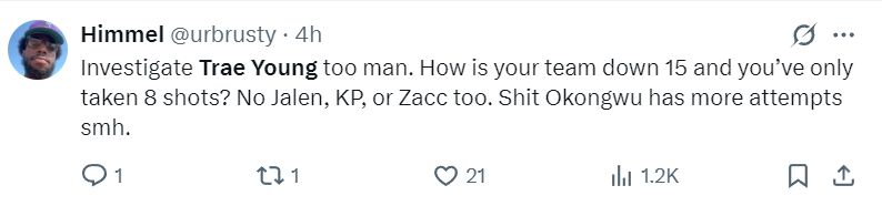 4.联盟好好调查一下特雷杨吧,球队落后15分他却不愿意出手,没有杰伦-约翰逊、波尔津吉斯、里萨谢的比赛他本该承担更多,但他竟然比奥孔古的出手还要少,这太糟糕了。