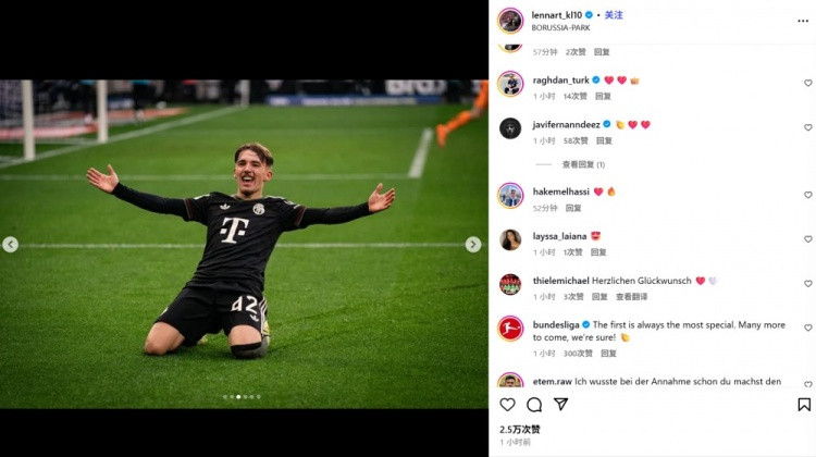 球员在赛后在社媒晒出自己的庆祝照配文加上了表情,同时还艾特了德甲联赛官方账号。德甲官方账号随后也在评论区现身评论到:“处子球总是很特别!相信你未来还能进更多球。”