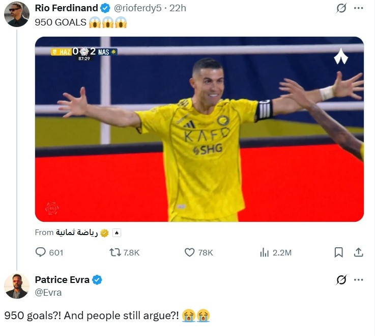 赛后费迪南德在社媒晒出了C罗比赛的进球片段,发了震惊的表情并配文到:950球!评论区埃弗拉在下回复到:950球!还有人在争论?