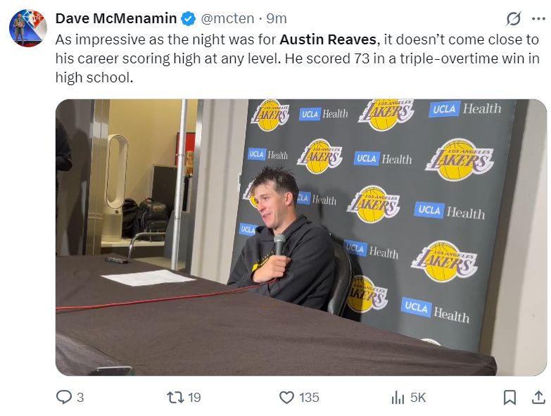 但赛后接受湖人媒体采访时里夫斯说道:嗯,这个夜晚的确非常精彩,但这跟我其他级别比赛创造的高分简直不值一提,我曾在高中的一场三加时的比赛中拿到过73分。