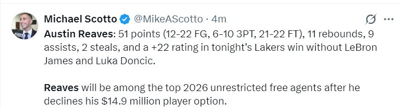赛后奥斯汀-里夫斯拿到51+准三双直接登上了全美第二热搜,这场比赛湖人的赢球全靠他,除了詹姆斯、东契奇、海斯、克勒贝尔、蒂耶罗无法登场外,第三节文森特也崴脚,里皇真的独扛一队。