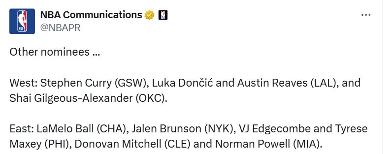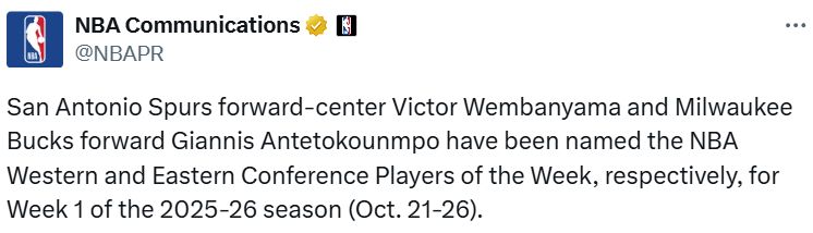 北京时间10月28日,NBA官方公布了新赛季首周的周最佳球员,马刺队中锋文班亚马当选西部周最佳球员,雄鹿队前锋字母哥则斩获东部周最佳球员荣誉。这是文班亚马职业生涯第二次当选周最佳球员,对于字母哥而言,这是他生涯第28次当选周最佳。首周的周最佳竞争激烈 ,东契奇和亚历山大场均40+的表现,仍无缘当选。