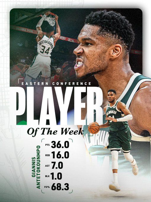 字母哥上周带领密尔沃基雄鹿队取得2胜1负的战绩,交出了极具统治力的数据单。个人场均得到36.0分、16.0个篮板、7.0次助攻和1.0次盖帽,三项命中率分别为68.3%、66.7%、62.9%。字母哥成为NBA历史上首位在赛季前3场比赛中,至少得到100分、40个篮板和15次助攻的球员。