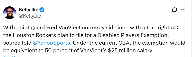 北京时间10月28日,据名记Kelly Iko报道,由于范弗利特膝盖受伤,火箭队计划申请一份伤病特例。若该特例申请获批,其价值将为1250万美元,相当于范弗利特2500万美元年薪的50%。