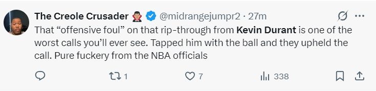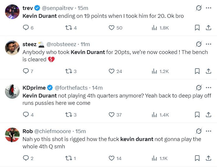 不少美国球迷对于杜兰特三节打卡十分不满,因为他们都希望杜兰特能拿到20+的数据,因为NBA陷入涉赌丑闻中,这些球迷都觉得杜兰特第四节被DNP有球场之外的因素。