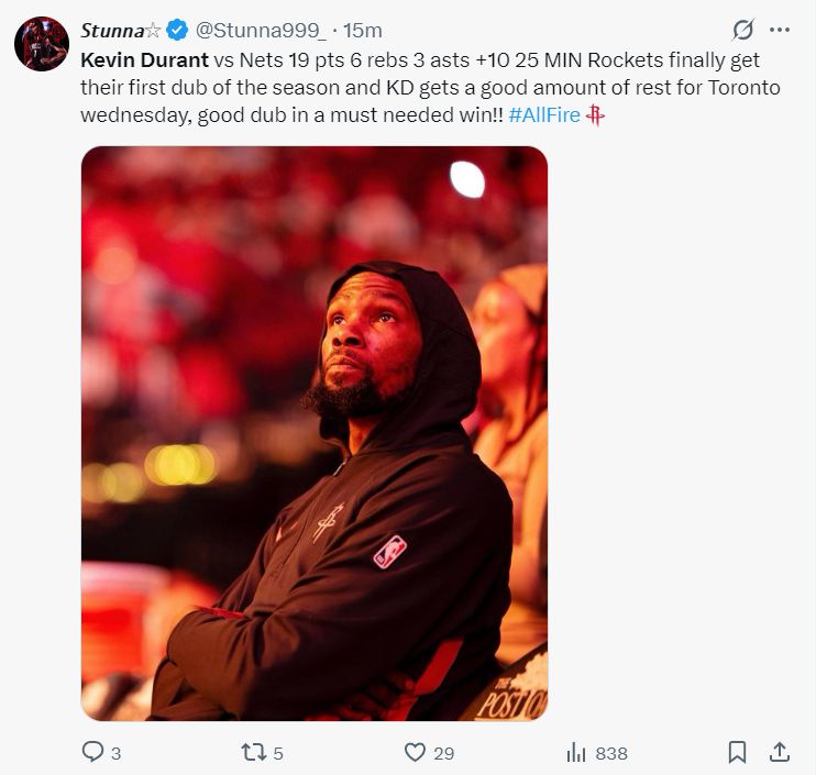 此役是杜兰特作为火箭球员首次面对篮网,KD的手感并没有那么好,首节是8中3+三分2中0拿8分2篮板1助攻,但有一个突破的暴扣。第二节杜兰特3中1+三分1中0拿到4分2篮板1助攻,半场打完KD11中4+三分3中0拿12分4篮板2助攻,他在防守端还被托马斯连续两次打爆,不过他已经是火箭第二位半场上双的球员。