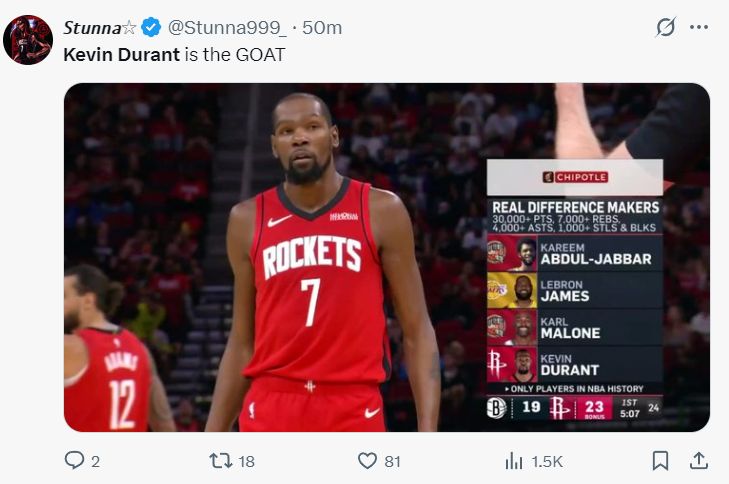 比赛第一节转播方给出,NBA历史上30000分+7000篮板+4000助攻+1000的球员只有贾巴尔、詹姆斯、马龙、杜兰特四人。休媒盛赞:杜兰特也是GOAT。