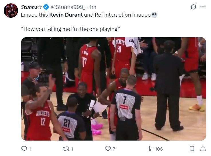 第三节杜兰特变向过程中击中了威尔逊的脸部,裁判看回放给了杜兰特犯规,杜兰特觉得自己是正常动作,这一节KD3中2+罚球3中3拿到7分2篮板1助攻1抢断,三节14中6已经拿到19分6篮板3助攻1抢断,杜兰特还没尽全力火箭已经大比分领先。