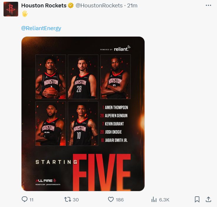 火箭:杜兰特19分6篮板,申京21分6篮板6助攻,阿门12分8助攻4篮板,小贾11分4篮板,奥科吉10分,谢泼德15分8助攻,伊森22分5篮板5助攻1盖帽0失误。