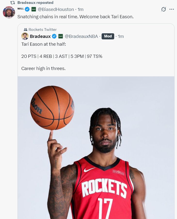 次节开场伊森助攻卡佩拉命中,伊森持球突破又造犯规,伊森第三个三分球命中,马丁三分命中,小波特三分也中,伊森命中第四个三分,伊森隔着两人上篮命中。萨拉夫三分也命中,托马斯迎着KD的防守三分命中,申京助攻小贾三分,伊森第五个三分命中,半场打完火箭还领先篮网11分。