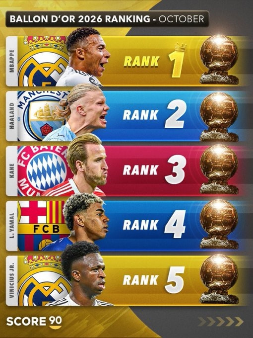 2026年金球奖排名:姆巴佩位居第一、哈兰德紧跟第二、凯恩第三