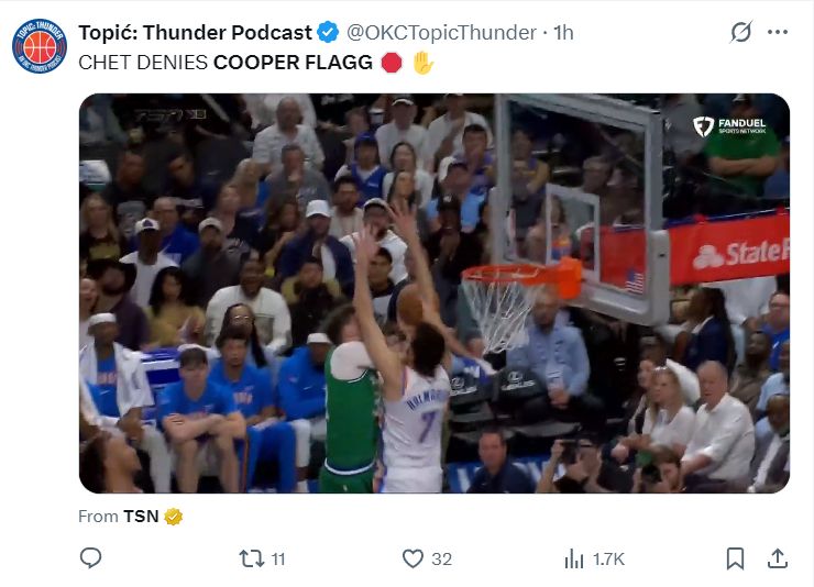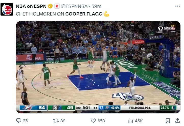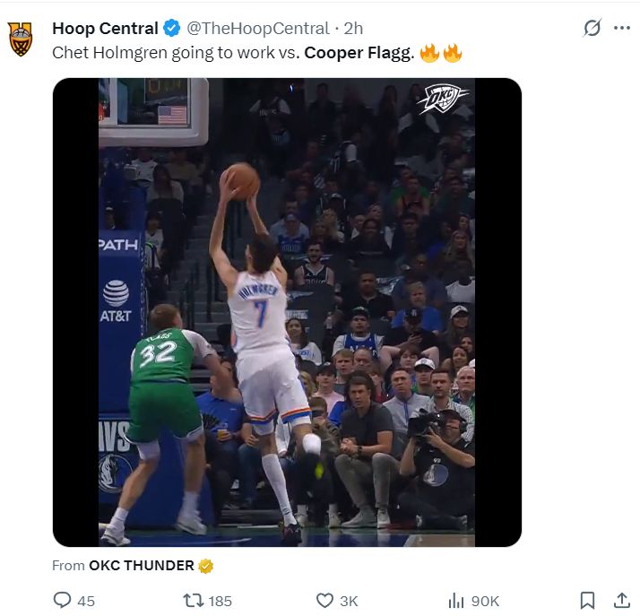这场比赛弗拉格多次对位霍姆格伦,霍姆格伦面对弗拉格直接完成隔扣,弗拉格2.06米的尺寸在切特眼里不值一提。