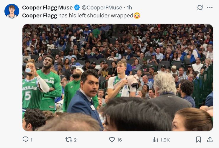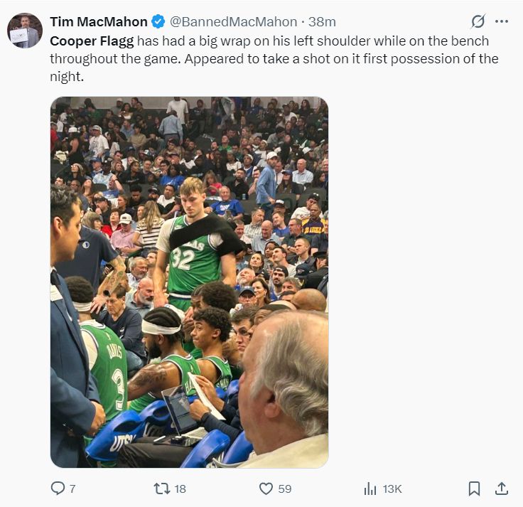 ESN记者蒂姆-麦克马洪赛后报道:弗拉格在替补时他的左肩肿胀很大,在开场的第一次进攻中他似乎就撞伤了自己的左肩。