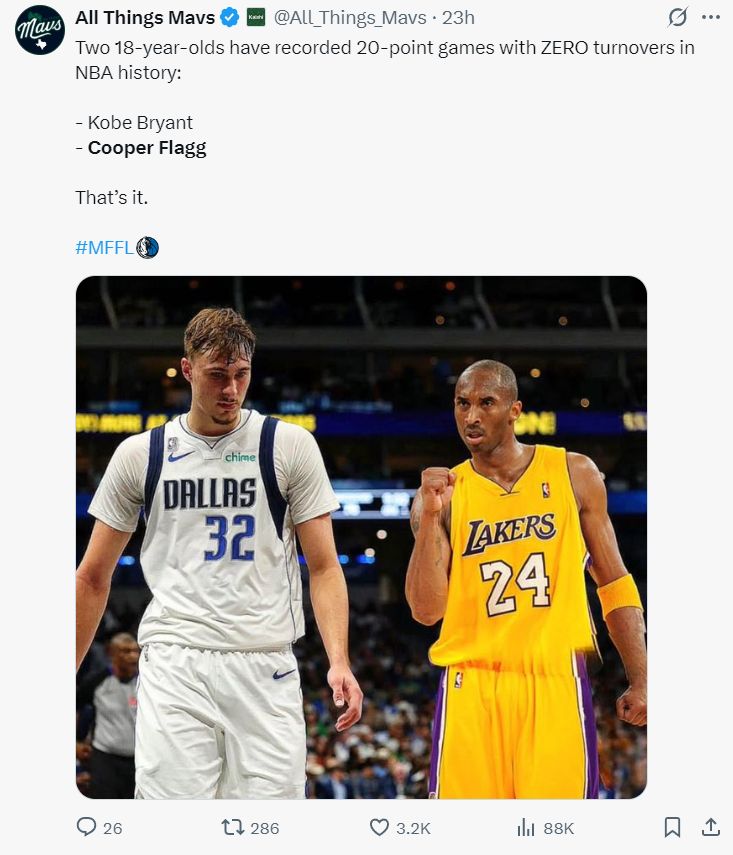 此役是独行侠背靠背第二场,上一场对阵猛龙的比赛,弗拉格拿到22分4篮板4助攻比肩科比,他是科比后第二位18岁拿到20+0失误的球员。