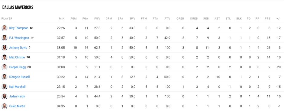这场比赛独行侠的核心浓眉38分钟,16中10+三分2中1拿到26分11篮板1盖帽竭尽全力,而他身边只有华盛顿、克里斯蒂两人在状态,克莱11中3、拉塞尔14中3、弗拉格9中1,马绍尔7中2。