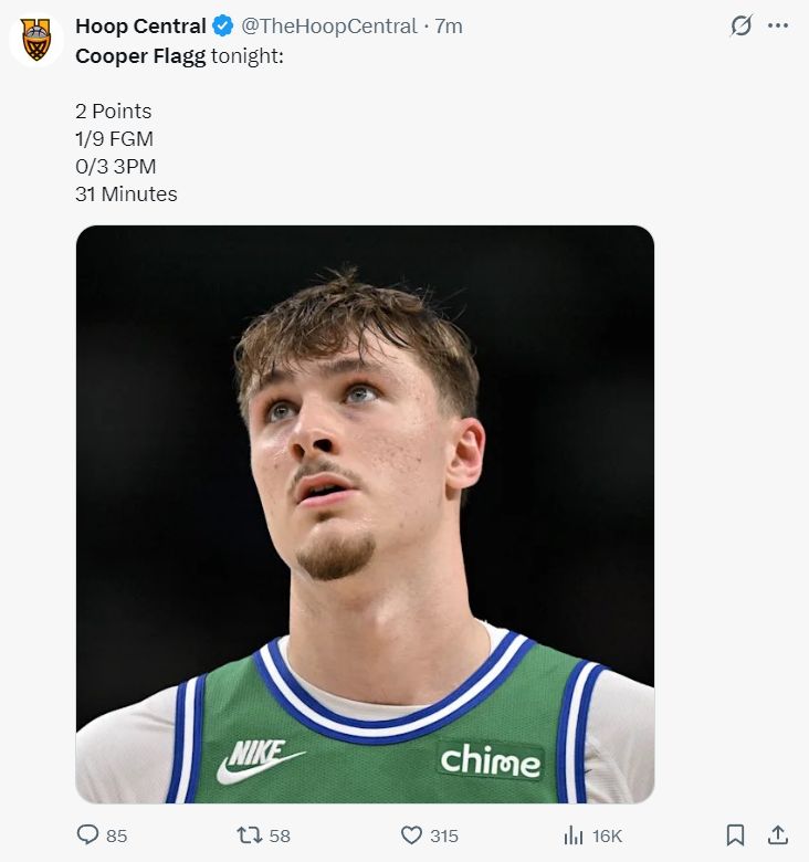 但这个夜晚,弗拉格鏖战31分钟,9中1+三分3中0,拿到2分2篮板0助攻2抢断0失误,命中率11.1%,三分命中率0%,真实命中率12.5%,正负值-20。