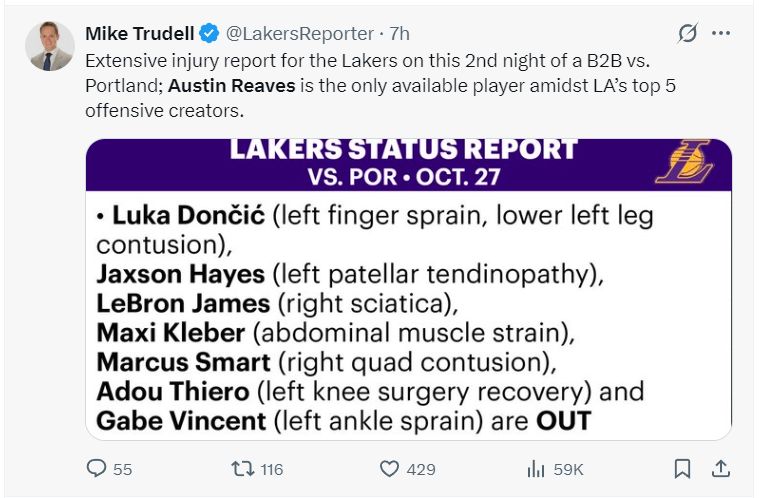 此役是湖人新赛季首场背靠背,东契奇、海斯、詹姆斯、克勒贝尔、斯玛特、蒂耶罗、文森特都不能打,雷迪克让范德比尔特登上先发,换言之又是里皇独角戏。