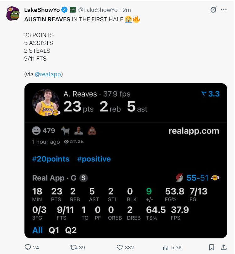 背靠背第二场VS开拓者,里皇依旧是湖人最无解的那个,19分钟,13中7,三分3中0,罚球11中9,拿到23分5助攻3篮板2抢断仅1失误,命中率53.8%,里夫斯半场又有11个罚球!他是两队上半场唯一拿20+的球员。