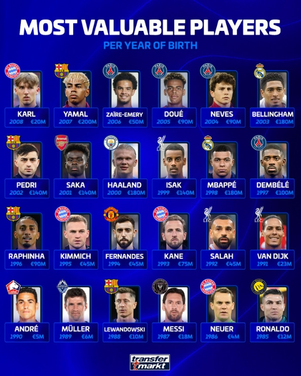 球迷屋10月27日讯,德转市场近期统计了各年龄段身价最高球员,梅西、C罗、哈兰德、姆巴佩等人悉数在列。