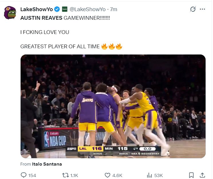 湖人官方发了一个奥斯汀-里夫斯的名字。