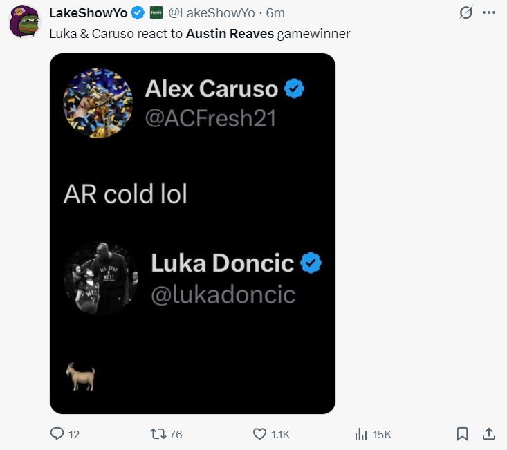 卡鲁索与东契奇都在IG上对里夫斯的表现做出了评价,东契奇又来一次GOAT。
