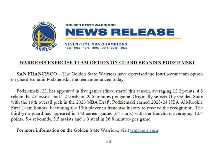 在截止日期到来前,这一操作被认为是必然结果。此举将锁定波杰姆斯基新秀合同第四年的薪资,金额为5679458美元。若他与勇士队未能在2026年休赛期达成提前续约,他将在2027年成为受限制自由球员;目前他已具备获得新秀合同提前续约的资格。