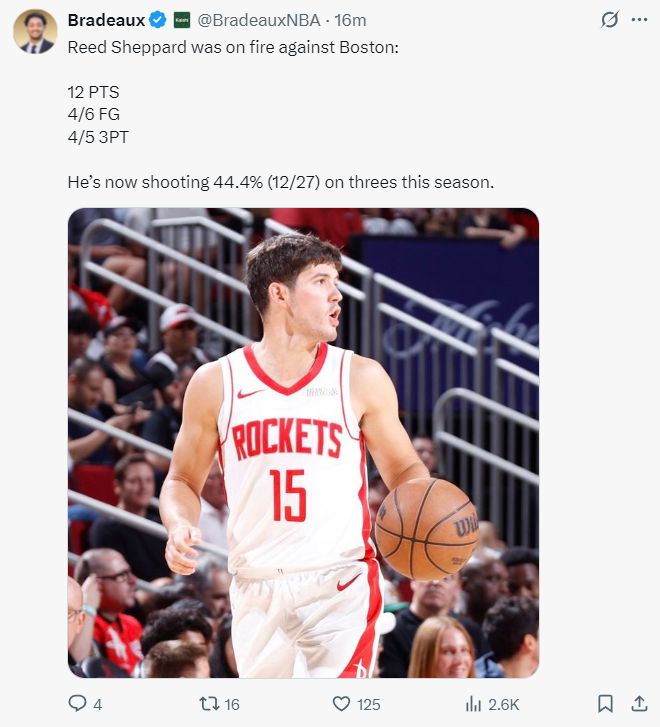 谢泼德这场比赛17分钟,三分球5中4,拿到12分3助攻,三分命中率高达80%,谢泼德在替补席的表现也越来越好,这对火箭的上限有着积极作用。