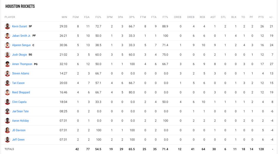 杜兰特29分钟26分4篮板,申京30分钟16分10篮板9助攻1抢断2盖帽,史密斯26分钟12分6篮板1抢断4盖帽,阿门32分钟17分9篮板8助攻,奥科吉21分钟12分2助攻1抢断,伊森12分6篮板。