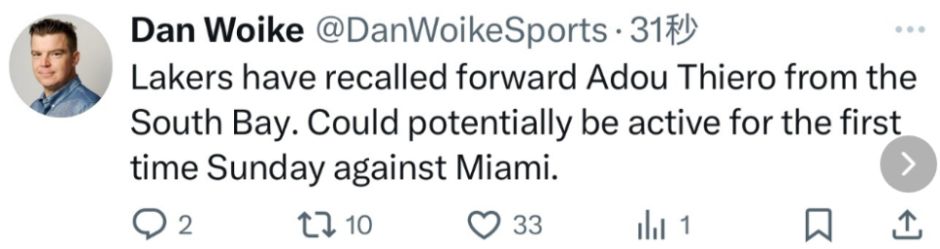 湖人新秀蒂耶罗本赛季尚未出战,他依然处在左膝手术恢复过程中,湖人此前将他下放到发展联盟南湾湖人队,但目前已经召回蒂耶罗,他依然不会出战对阵热火的比赛。