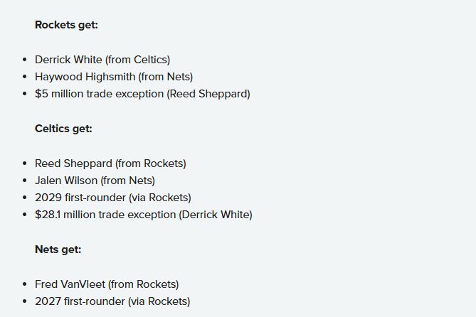 这笔交易的成本是送走谢泼德,以及两个未来首轮签——这两个签位分别是火箭队在2027年和2029年选秀中顺位第二高的签。