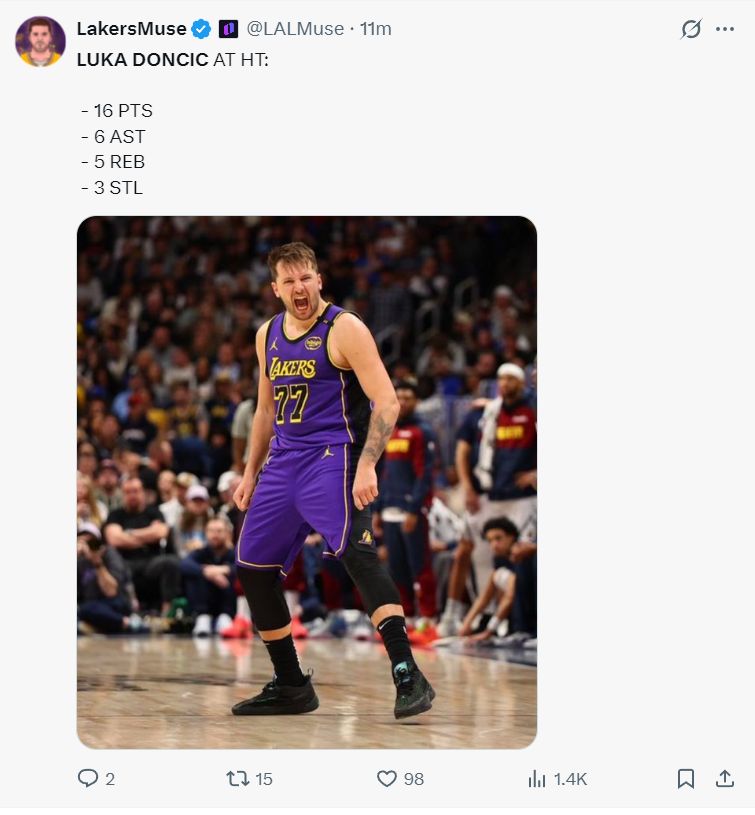 末节东契奇在场下休息,湖人的防守出现巨大问题雷迪克各种骂脏话,东契奇立马登场一个慢三步后仰命中,东契奇指着八寸垒要掩护八村无动于衷,东契奇气到跳脚,东契奇完成三双后抛投再度命中,东契奇决胜2+1拿下后拉开到12分直接锁定了胜局,随后东契奇继续罚球比赛走向完结。