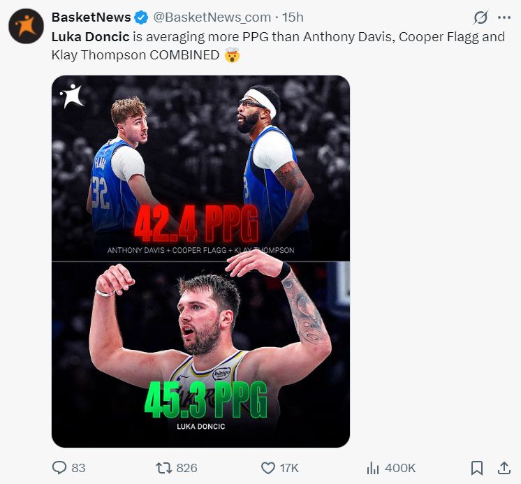 东契奇开赛季的三场比赛都拿到40+十分炸裂,他场均45.3分,而戴维森+弗拉格+克莱三人场均合计才42.4分,美媒BN借此来嘲讽独行侠送走东契奇是一个巨大的错误。