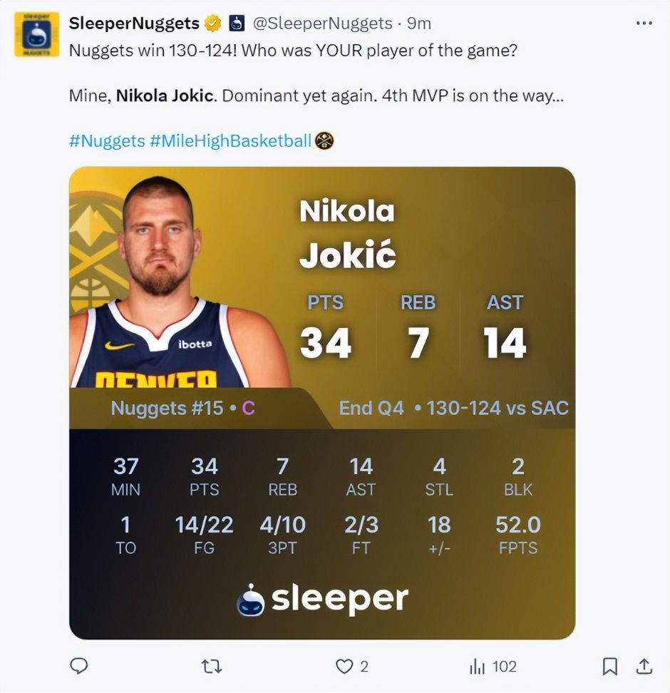 掘金媒体:我认为约基奇要拿下他个人职业生涯第四次MVP了。