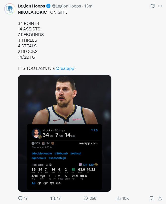 北京时间11月4日,掘金以130-124击败国王避免连败。这场比赛尼古拉-约基奇攻防两端都没有任何的拖泥带水,他完完全全是吊打小萨,而且国王的小阵容面对约基奇等于是白给,约基奇是22中14拿到34分14助攻7篮板,效率值太高。
