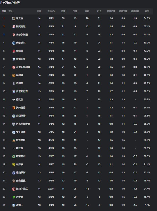 现英冠的球队积分排行榜,由前英格兰国脚兰帕德带队的考文垂积以31分领跑,斯托克城在近期豪夺三连胜球队目前在排行榜上升至第二。米德尔斯堡、米尔沃尔、查尔顿和普雷斯顿分列3-6位。近两个赛季征战过英超联赛的莱斯特城第和谢菲尔德联分别排名第13和第22。