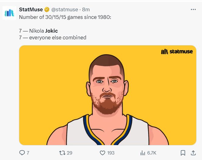 5.自1980年以来约基奇30+15+15场次7次,其余球员合计7次;
