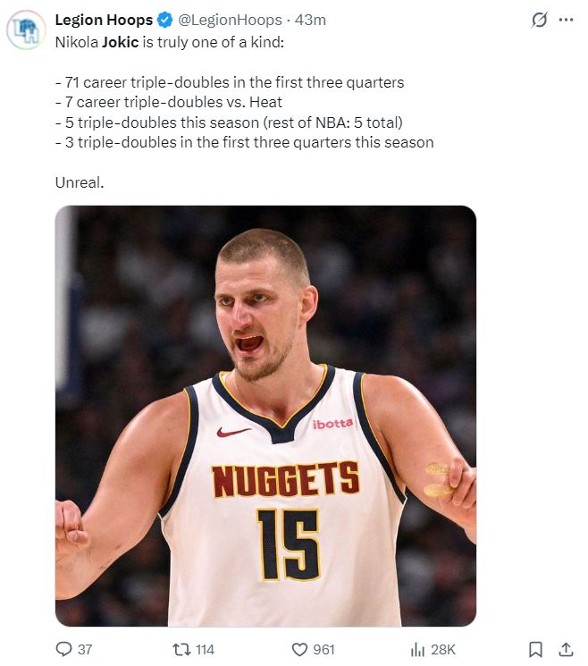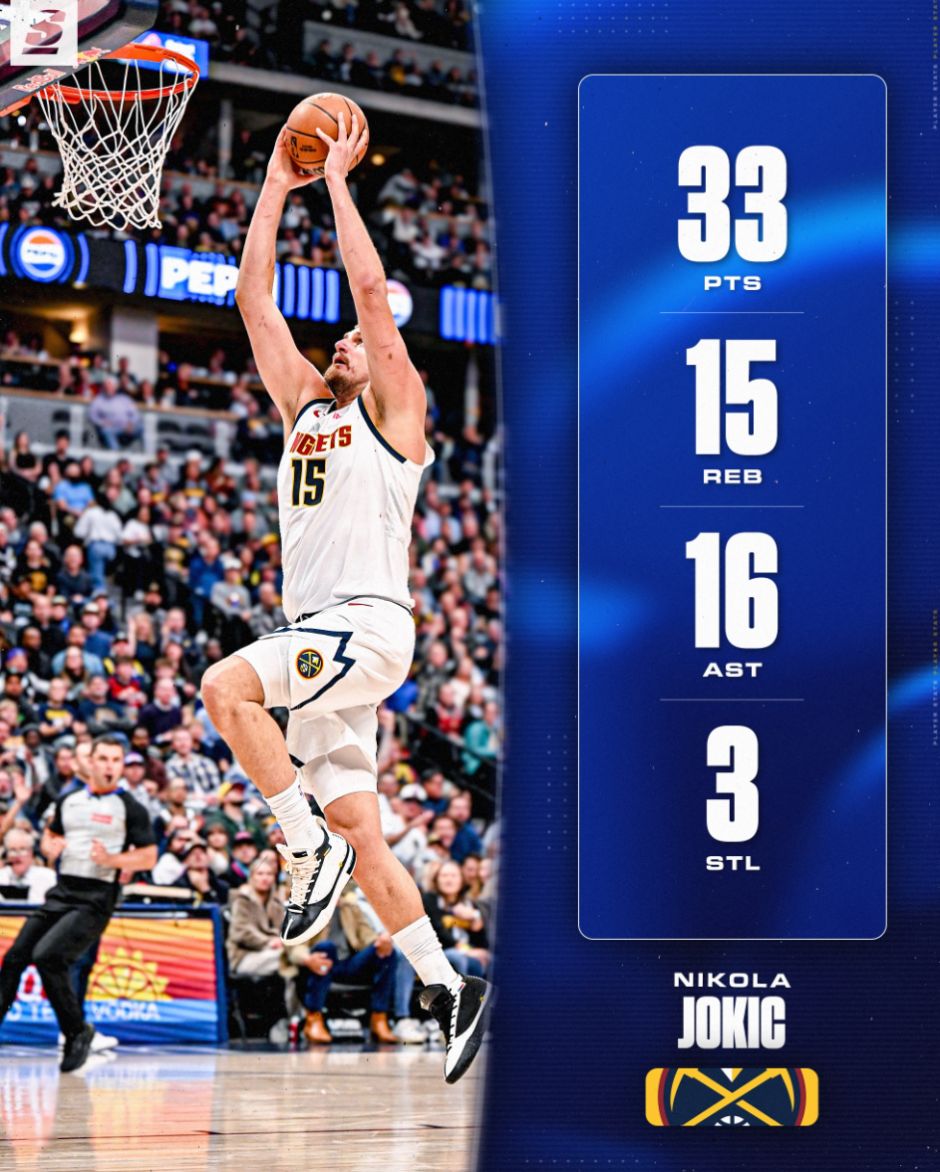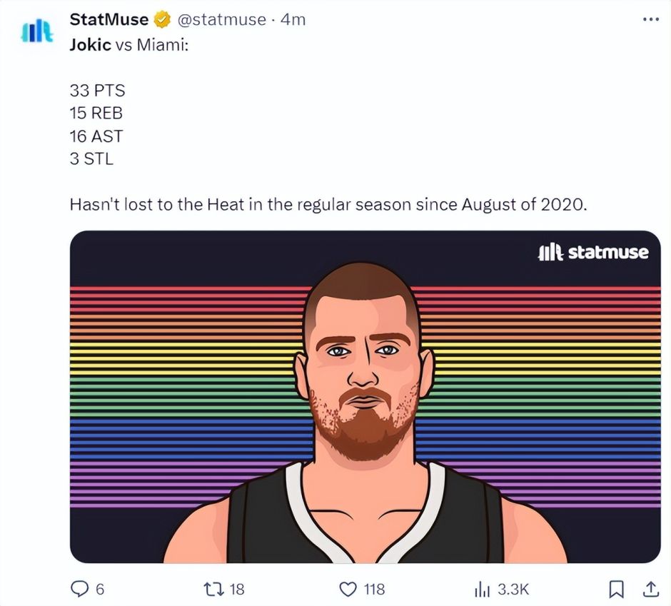 丹佛掘金122-112大胜迈阿密热火拿到二连胜。这场比赛尼古拉-约基奇三节就拿到三双,末节送出关键助攻浇灭热火的反扑气焰,感觉约基奇拿到30+三双只是微微出汗,约基奇已经是联盟全新的三双魔兽。